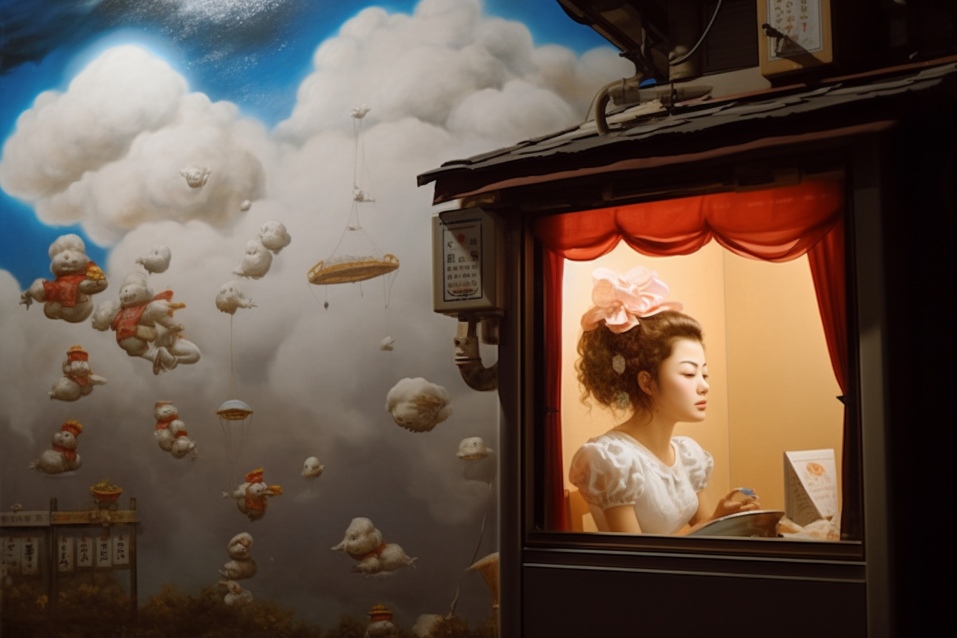 Nebo tady – extrémně se mi líbí, jak Midjourney interpretovala prodejní automat na levé straně fotografie: